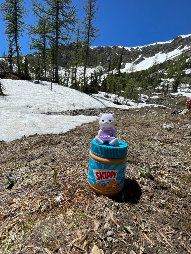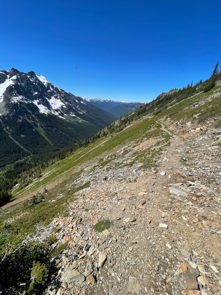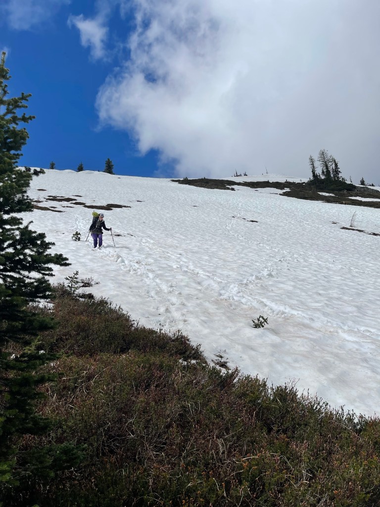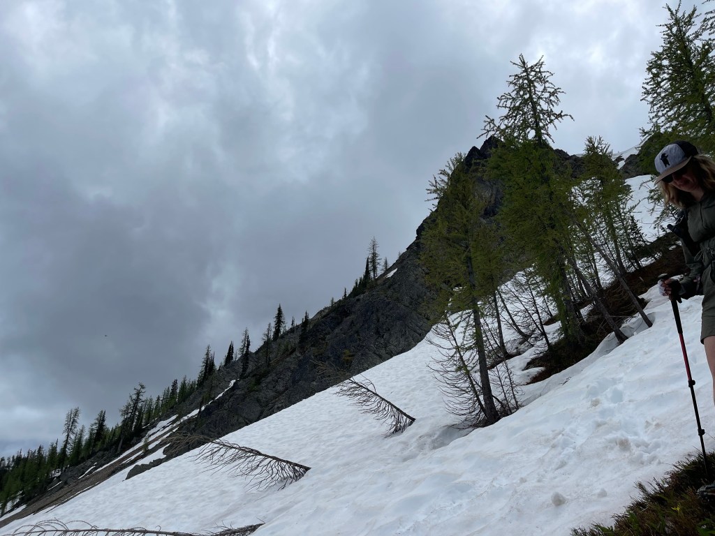 On day 7 we hiked up to Cutthroat Pass which definitely lived up to the name. There was a bunch of snow and we had to put on our microspikes and use our ice axes yet again. There were some switchbacks and steep climbing up and over the pass, and then a field of snow along the mountainside that we had to navigate. The snow layed on top of loose rock and gravel and made for real slow traveling. The “optimist” and I turned to see how the third person in our group was getting along in the snow only to find that she was nowhere to be seen. She had slid down the mountainside and self arrested. It was frightening to see how quickly and quietly things can go wrong. She was okay and we kept moving. After about 5 miles we were finally able to take the microspikes off and put the axe away! The rest of the hike to our campsite was downhill and relatively flat. We hiked to Rainy Pass and ate lunch right before crossing over highway 20. We camped at the “Six mile campsite” which is a popular place for bears to frequent. There was a bear box to store our food and smelly stuff in, a “toilet”, and a great creek. I washed some of my clothes and even washed my hair which felt amazing. I packed more food than I needed to get from Harts Pass to Stehekin so I had a big dinner. Two instant rice noodle packets, peanut m&ms, Godiva chocolate, and hot cocoa. Okay, it was really just a big dessert. The hiker hunger has started to set in.