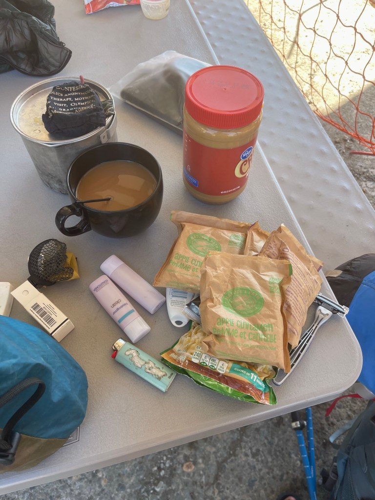 There were some outhouses here but you couldn’t pay me to use them. We set up our tents outside the cabin and had our dinner on the front porch. Funny enough, Autopilot and I both had Kraft mac and cheese for dinner! I also had some dark chocolate Reese’s and peanut butter. It was a really pretty spot that overlooked an open grassy meadow and we could hear the stream trickling nearby. We talked with lots of NOBO hikers and told them about some of our favorite spots on the trail so far. It was an early night though because we planned to get up early and get through a burned section of the trail before the sun hits us. I’ve been feeling very grateful to be out here and I am so excited to keep going and see what else the trail has in store. I could eat peanut butter in the woods for the rest of my life.