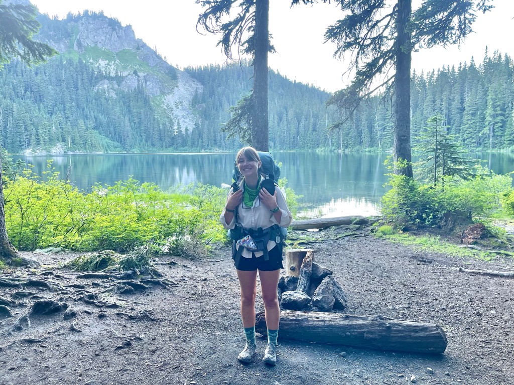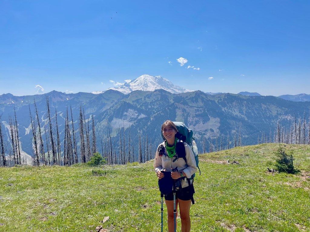 On day 23 we got up and decided to walk 14.7 miles to a creek and tentsite. Sheep Lake was about a mile away from the Chinook Pass trailhead where we cross the road and continue onto the trail. There were bathrooms and garbage cans here which were a treat to us. We could get rid of some of our trash, making our packs just a tad lighter. We crossed into Mount Rainier National Park. It was a Saturday morning and there were lots of people out hiking. I forgot how frustrating it can be to be hiking with so many other people since some are faster and some are slower. We passed a couple people finally. I also ran into one of the most unpleasant hikers I have ever met. This woman would not move aside to let me pass since I was going a bit faster, I had to ask if it was okay for me to scooch past. She then yelled at a man who was walking with a dog and said that dogs were not allowed on the trail. She saw a couple behind me who had two dogs and told them the same thing. When someone moved off the trail to let another hiker pass by she yelled at them for ruining the trail. I should have asked her where her forest ranger uniform is if she’s such an advocate for the trail regulations. Moments like that are a good reminder to hike your own hike, as in don’t pay attention to what others are doing since it’s really not concerning you. The 14 miles to the creek were pretty gradual and very pretty. I loved smelling all the sweet pine trees along the way. We got to the creek around 12:30 and set up our tents since there were some mosquitos. I took a great nap and had a filling lunch.