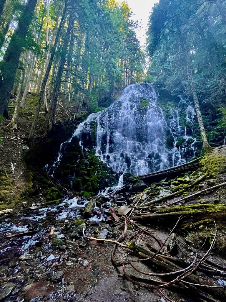 Day 37 we left camp around 6:50 and started hiking for the day. We had a lot of ascent and descent before we got to Timberline Lodge. We went up about 900 feet in 1.5 miles and down 1,300 feet in about 3 miles. Here we took an alternate route that reconnects with the PCT. This route took us past Ramona Falls which was a big waterfall.