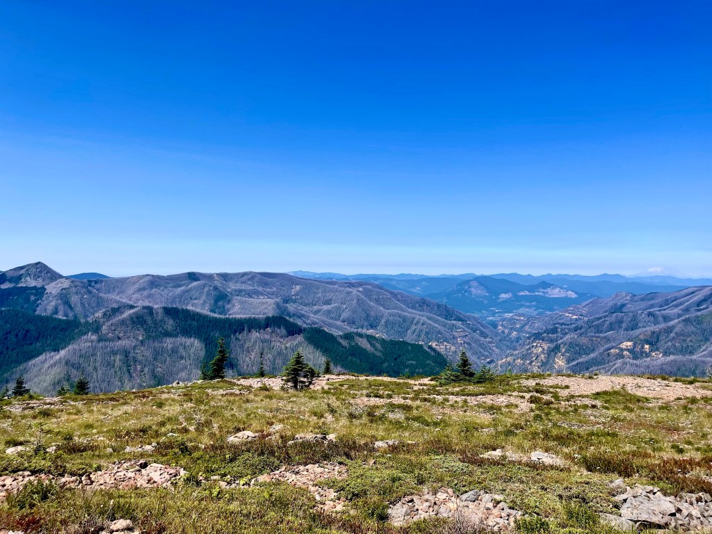 However, I walked about half a mile and there was a great view point of Mount Adams, Rainier, and St. Helens. So we had lunch here. I enjoyed the view while I ate and let my shoes and feet air out. I had service here and messaged a bit with my younger brother. He was getting ready to leave for college the next day. I felt sad that I wasn’t going to be there to help him move in, and I missed my family a bit. I tried not to think about it too much, but I did for the next couple hours. I just told myself that I will be able to visit him once I’m done with the trail. When I get a little sad like that I just end up writing more poetry before I go to sleep.