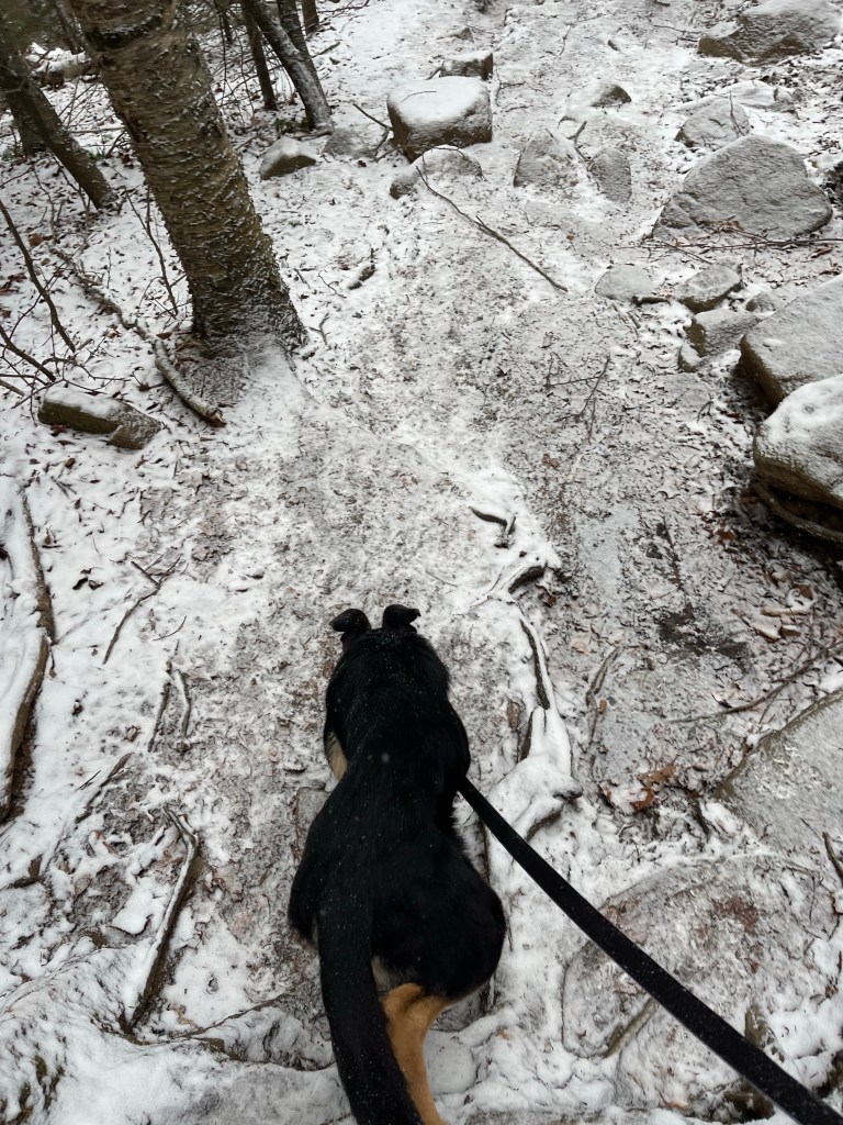 I wore my microspikes all the way to the car on the way down. I could have taken them off when we only had a mile left of the trail but they just helped me move quicker so I kept them on. Cash had to be lifted over one patch of ice on the way down. I carried him just so he didn’t jump on top of the ice and slide down the trail.