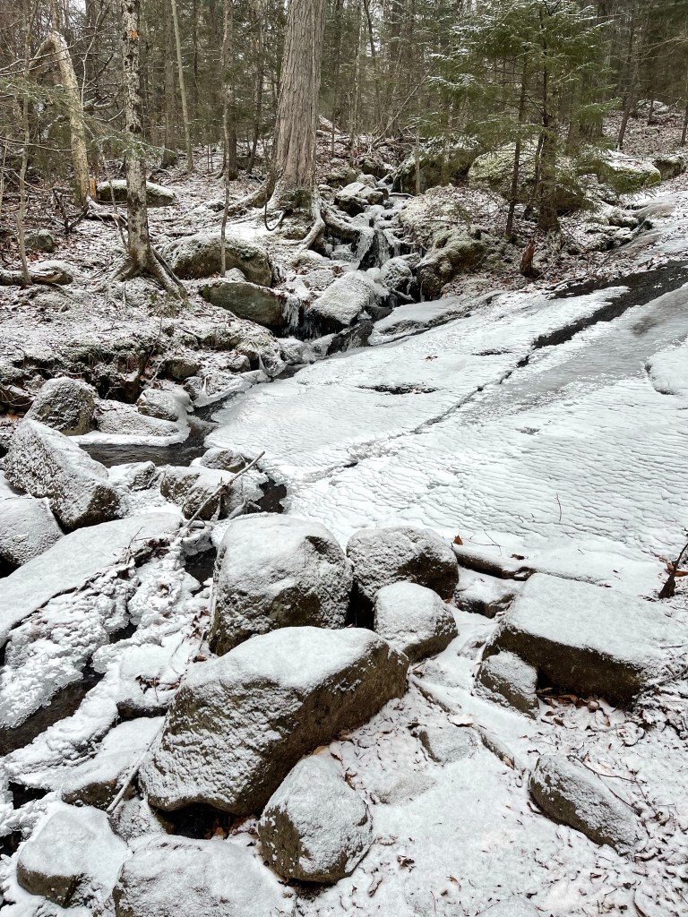 The trail is pretty easy to follow even though there are not a lot of trail markers. When I was hiking there were two streams still flowing with water and easy to rock hop across. The rocks on the trail for the first mile were easy to walk on without spikes. Around the 1 mile mark, though, we put spikes on to help with traction. There were a couple parts of the trail with thick sheets of ice on the rocks where spikes were helpful. All of it was easy to walk on, even for my dog. Sometimes he went off of the trail a little bit to escape the slippery ice, but he was able to navigate it all pretty easily.