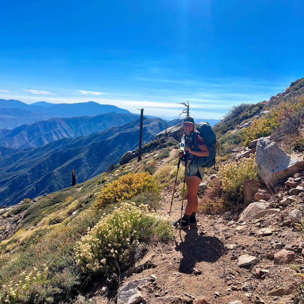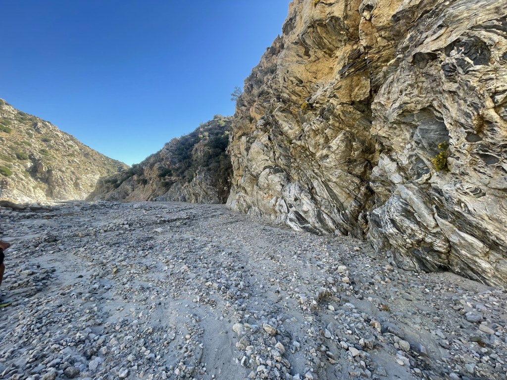 On day 43 we had some off trail walking. We walked about 7miles mostly downhill to our first water source at Mission Creek. Here we had breakfast and talked about our plan for the day. The trail was washed out for about 10 miles from Hurricane Hillary. So we decided to walk on the trail for as long as we could and then eventually dip down into Mission Creek and walk in the creek bed for the rest of the way. The actual trail was a little annoying. It was either the nice regular footpath or some sketchy dirt that’s easy to slip on, which I did a couple of times. At lunch time we started walking in the creek bed. This wasn’t super fun. But it was super pretty, the rocks were interesting to look at. And it was interesting to imagine what the water looked like when the hurricane went through.