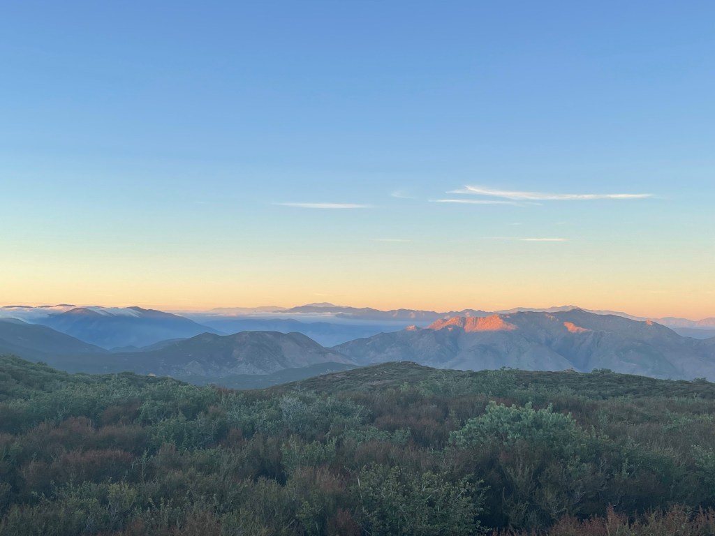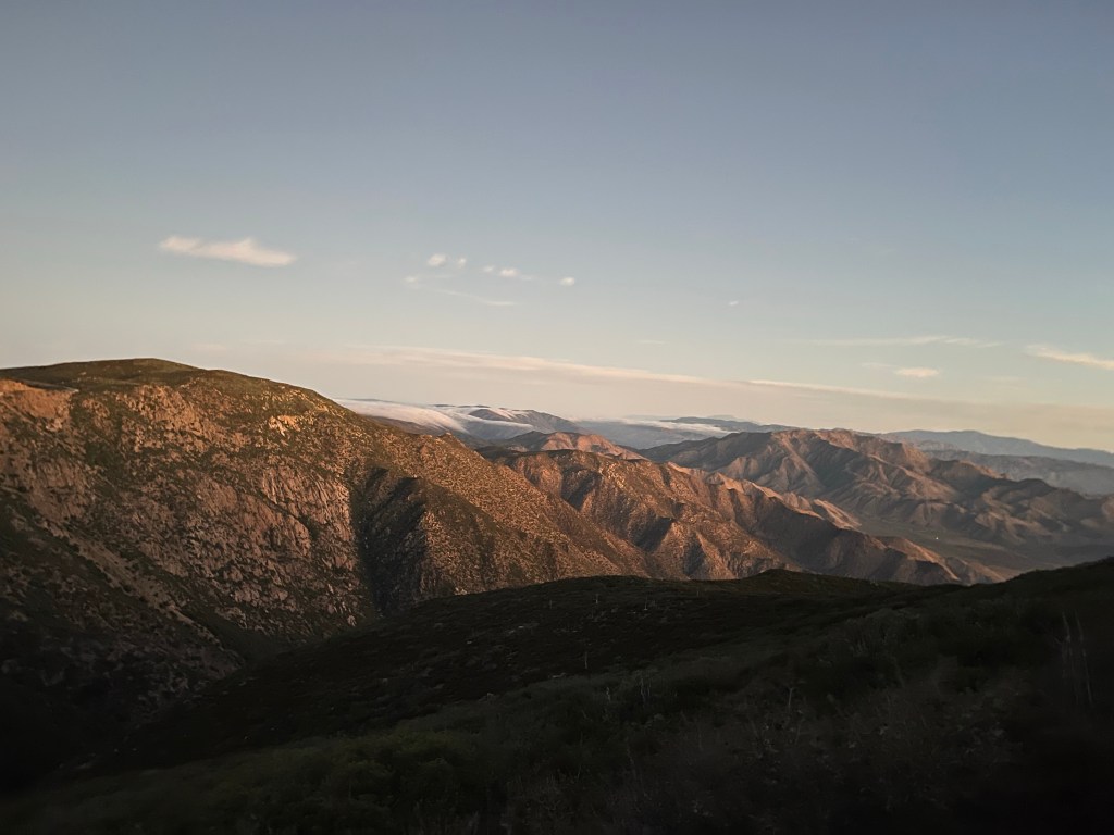 On day 55 I left camp around 6 and started our 10 mile walk to the Mount Laguna Post office and store. The trail was gorgeous over those 10 miles. I stopped a couple of times to take pictures and enjoy the views. The clouds were still hanging low in surrounding mountains which looked neat in the dark morning sky.