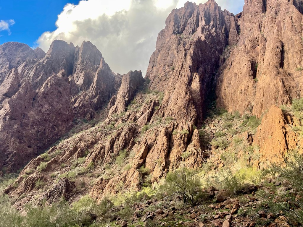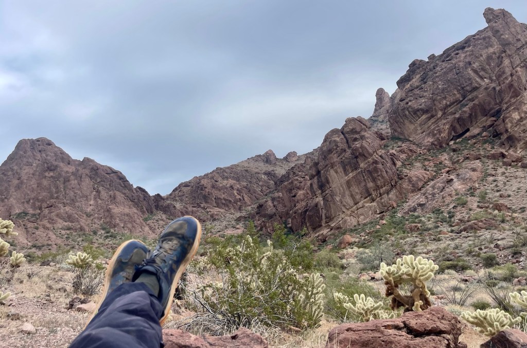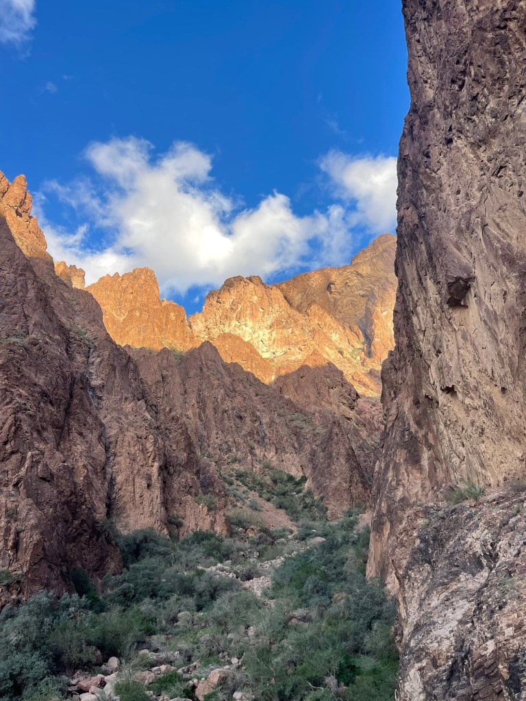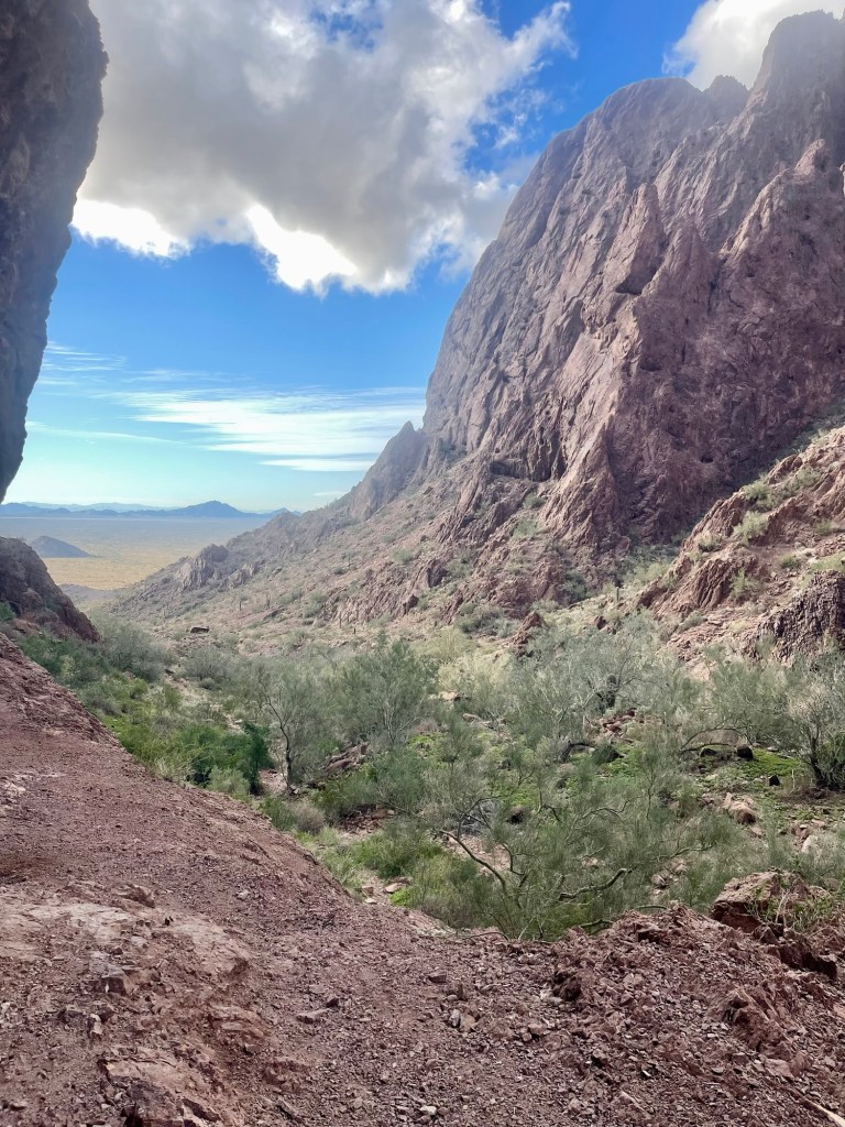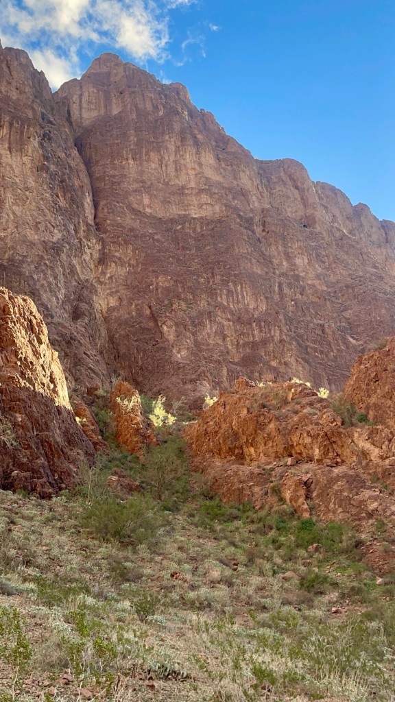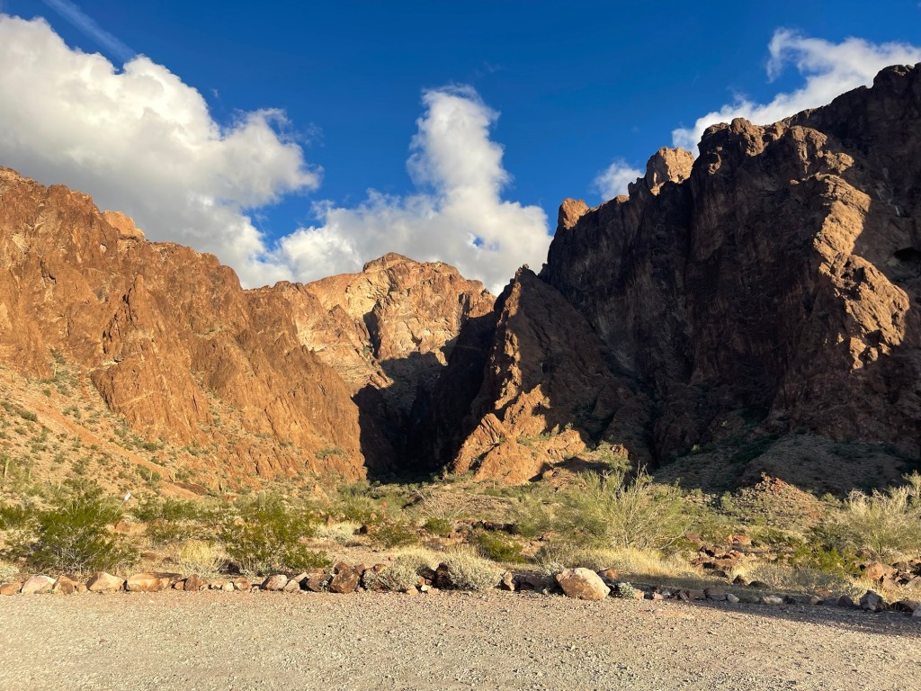 Unfortunately, I did not plan well and Cash and I did not end up seeing the palm trees. On our way to the trailhead there was a van camping on the road that we passed by. Their dogs were not leashed well and one of the dogs charged at us. It took the owner a minute to get a hold of their dog but it was a frightening couple of minutes as I was trying to walk away with Cash trying to protect us and this random dog not taking a hint. It made me pretty angry and definitely spooked Cash. So after that I was not keen on staying out super long just in case the dog wanted a round two. I also forgot to bring my headlamp on the walk and realized if we kept hiking to see the trees we would be navigating our way back in the dark, which is not my favorite. Andddd, Cash’s paws were getting a bit sore with all of the jagged rock. So that will just be a hike for the next time we go back. Even though we did not see the trees I did enjoy walking into the canyon with the steep cliffs surrounding us and all the interesting rocks around us.