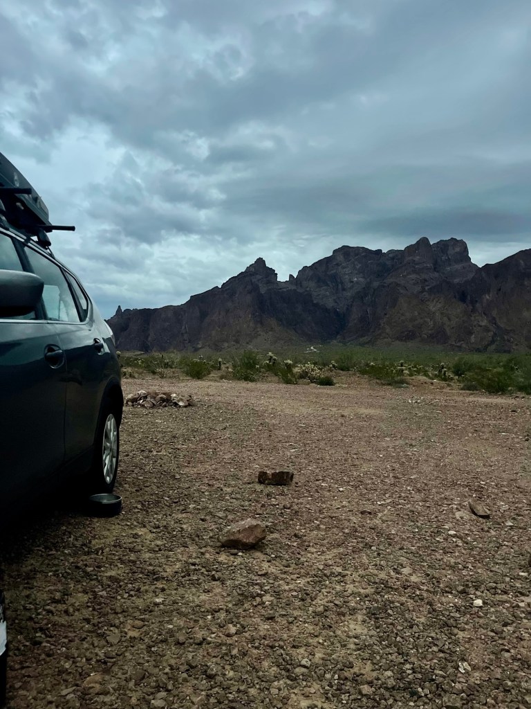 In the morning I woke up to some light rain but great views of the Kofa mountains. I decided to continue on down the road, going as far as Scout could take us. Pretty quickly I realized that the entire 7 miles of road was passable in the car, I just had to find a camp spot I liked! I wanted to get pretty close to the mountains, and I succeeded in that. I found a great spot just a mile from the end of the road. I pulled off the road and scouted out the site.